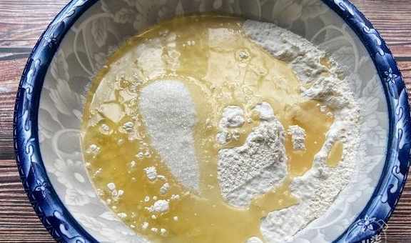 第三步:接下來和油面,盆裏放入200克低筋面粉,沒有低筋面粉普通的也可以,倒入100克玉米油,油選擇淡一點的味道,攪拌成粘稠的麵團。