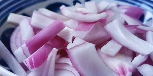 3.現在開始我們來準備配菜,洋葱清洗乾淨後,切成小塊,裝入盤裏。白蘿蔔去皮,清洗乾淨,先切成厚片,然後改刀切成粗條,裝入盤裏。薑去皮,清洗乾淨,先切片,再改刀切成細絲,裝入盤裏備用。