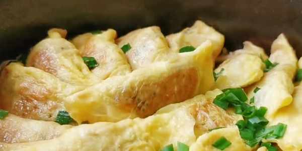 4.準備一個碗,把雞蛋打入碗裏,先用筷子把雞蛋攪散,放一旁。起一鍋,裡面放入少許食用油,刷均勻。用勺子舀一勺雞蛋液,轉動出一個圓形的雞蛋餅。在雞蛋液凝固前,用筷子取適量的肉餡放在雞蛋餅上面,再用筷子夾住雞蛋餅的另一邊,蓋過來,繼續用筷子把邊緣按壓緊,這樣我們的蛋餃就做好了。這樣的蛋餃做起來非常的簡單,幾秒鐘就能做一個,把所有的蛋餃全部做好,放入盤裏備用。