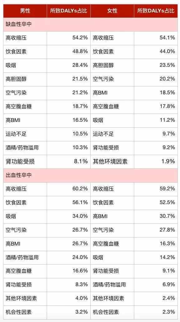 全球疾病負擔研究報告指出,腦卒中有10大危險因素, span>包括高收縮壓、飲食因素、吸烟、高膽固醇、空氣污染、高空腹血糖、高BMI、運動不足、酒精/藥物濫用、腎功能受損。