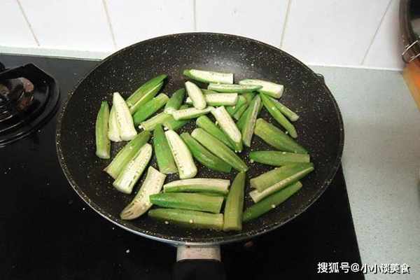 第三步:鍋中油燒熱,鍋熱後倒入少許油,然後將切好的洋蔥放入鍋中,加少許鹽炒香,等洋蔥變軟後放入鍋中把它們放在鍋裡。不洗,將秋葵放入鍋中,翻炒至秋葵微微金黃。
