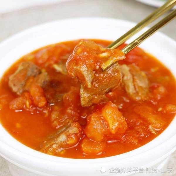 5.牛腩煮好瞭,我們把牛腩先夾出來,把鍋裡的料渣全部濾除幹凈,然後轉成大火收濃汁後倒入牛腩碗中。因為牛腩部位的筋膜會很多,所以最後的濃汁滿滿的膠原蛋白,一會和番茄結合的時候完全不用再勾芡掛汁。