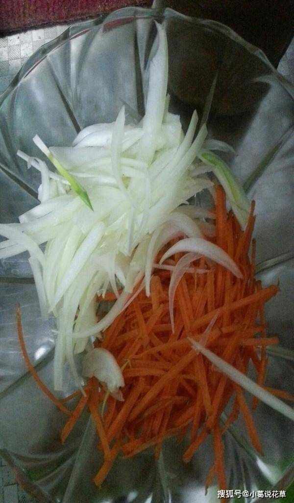 幹豇豆30克,胡蘿卜一根,蔥半根,精鹽適量,薑適量,醬油適量,花生油適量,大蒜適量