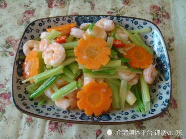 ④接著倒入芹菜、胡蘿卜翻炒,炒到斷生,再倒入蝦仁翻炒均勻。