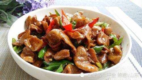 3、青紅椒切小塊,把大腸水分煸幹裝盤。