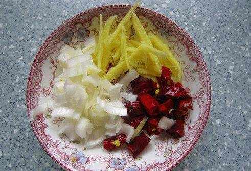 *2步:切割鏡片並放在一邊以備後用。將準備好的薑、蔥洗凈。洗凈後,薑切碎,蔥切丁。然後將紅辣椒洗凈,切成方塊。全部材料處理好後,開大火燒熱鍋,鍋熱後加入適量的油。