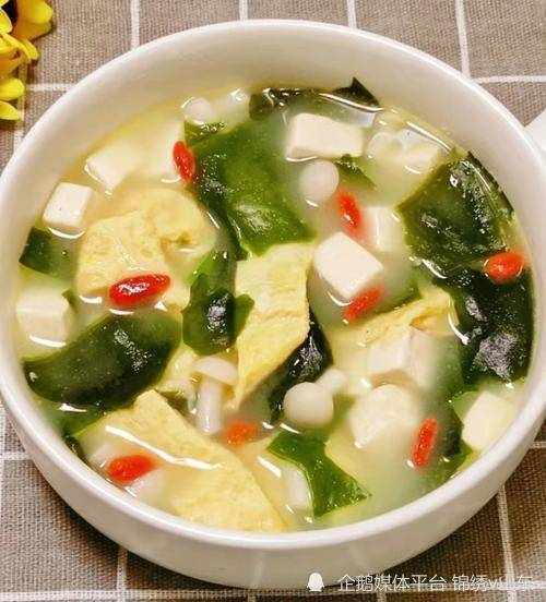 食材:裙帶菜,嫩豆腐,雞蛋,枸杞子,薑絲。