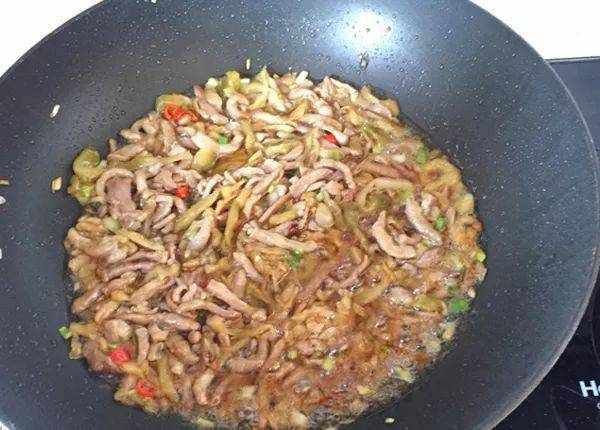 5. 榨菜下鍋翻炒。