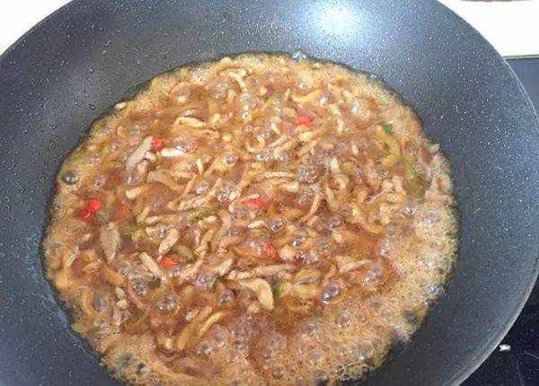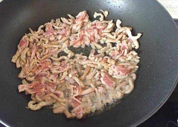 3. 燒熱油將醃好的肉絲下鍋煸炒至變色盛出。