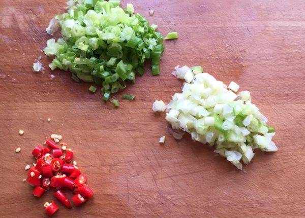 2. 香蔥切碎,辣椒切好。