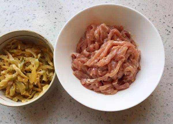 1. 裡脊肉切細絲。裡脊用少許料酒,鹽,油,淀粉抓勻醃制15分鐘。榨菜切細絲
