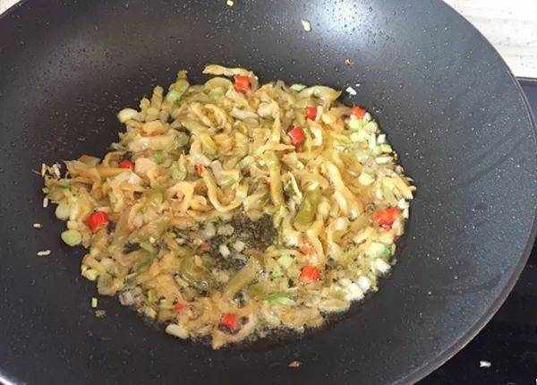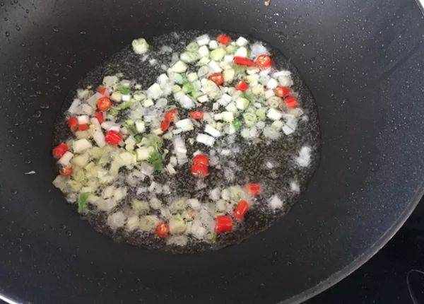 4. 重新置油,把蔥碎和辣椒下鍋爆香。