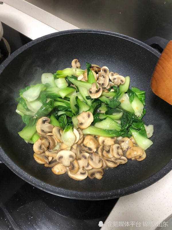 ①我們把菜臺掰開,泡入淡鹽水中10分鐘。搓洗幹凈,瀝幹水分。把口蘑裡面的莖掰掉,泡入水中。搓洗掉菌帽表面的雜質,洗幹凈後瀝幹水分,切成薄片。