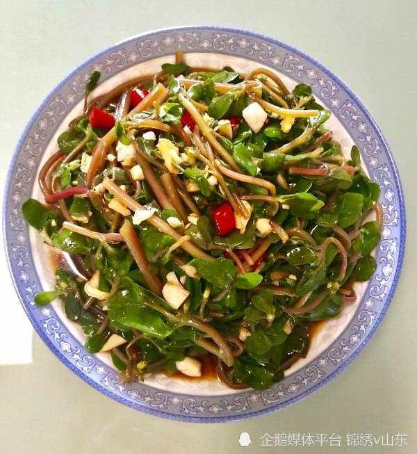 4、 將馬齒莧放在盤子裡面,將調好的醬汁倒在蔬菜上面,吃的時候充分攪拌均勻即可。