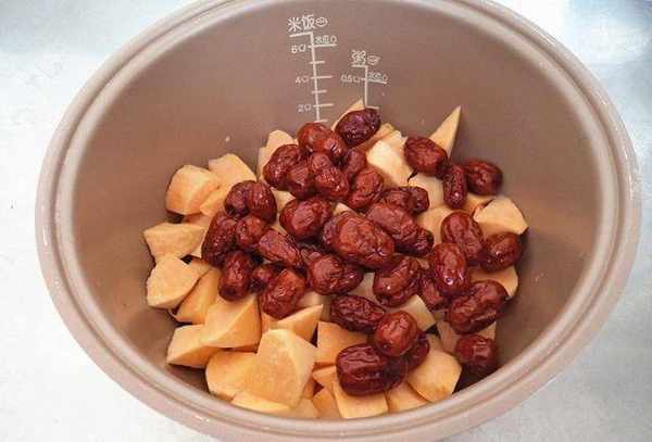 Step3:所有材料準備好後,先把紅薯放入電飯鍋,將紅薯放入鍋中,鍋底盡量鋪平,這樣紅薯越軟越容易爛均勻受熱,然後取出泡好的紅棗,先將紅棗洗凈,然後放入鍋中洗凈,然後倒入清水。水的量不要超過食材,因為扒粥已經用瞭很多水,蒸粥如果水少瞭,粥就不好吃瞭,會變得有點糊狀。