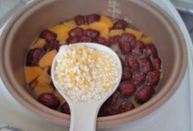 第四步:蓋上鍋蓋,按下煮粥按鈕,燉一個小時左右,然後將泡好的大米和小米放入鍋中。由於米是提前泡過的,米粒已經變大瞭,所以煮的時間也不會太長。然後等到食材都熟瞭就可以上桌啦!