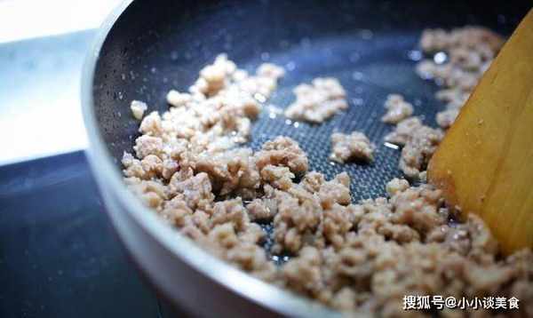 3、先將肉末炒熟。我們在鍋裡放一勺植物油,加入一勺十三香一起炒,不停地翻炒,炒香,然後加入肉末翻炒,不斷地攪拌,直到肉末變色出油。