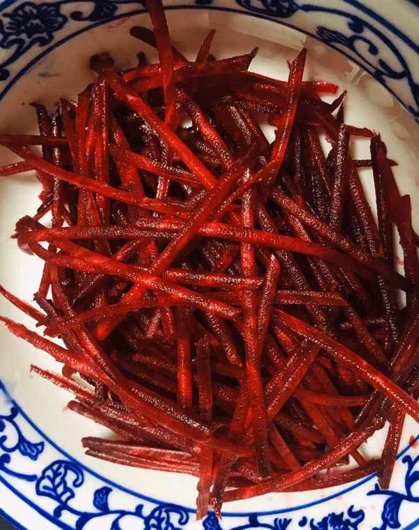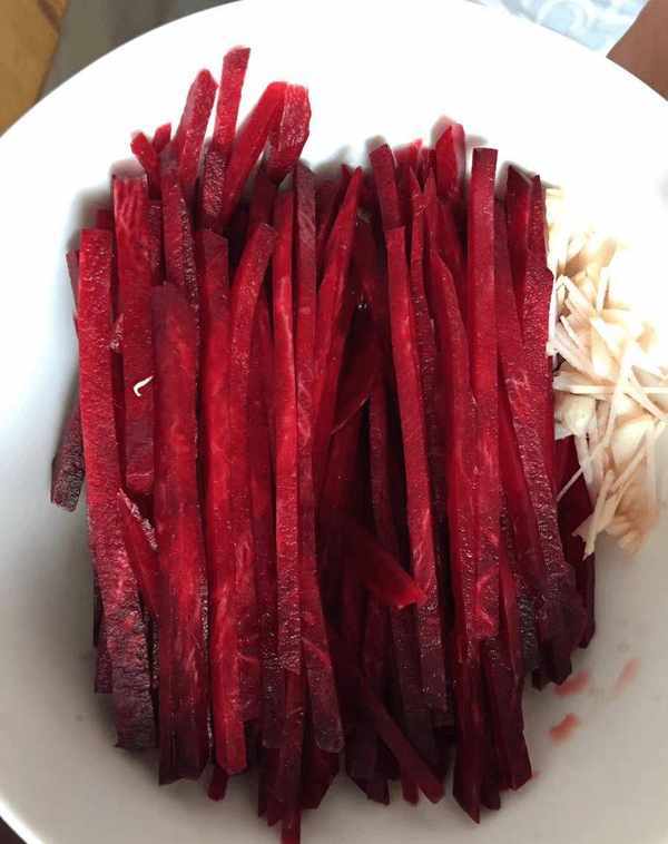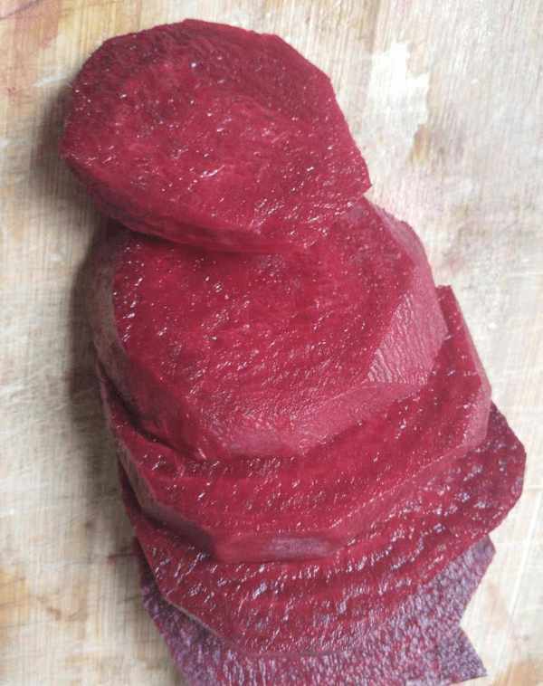 1、首先我們對甜菜根進行表面處理,將甜菜根用清水洗凈,切成片,然後切成條狀。