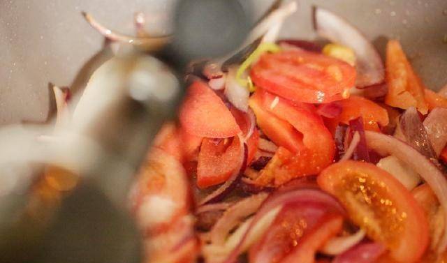 3、接下來放入西紅柿翻炒出番茄汁,很好吃。炒西紅柿的時候加半茶匙鹽,這樣西紅柿能盡快炒熟。