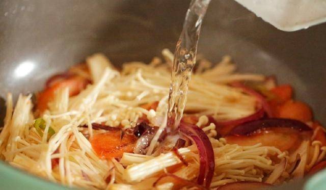 5.放入半杯水、一勺蠔油、一勺番茄醬、半勺鹽和一勺醬油,用文火燉一會,讓金針菇入味。