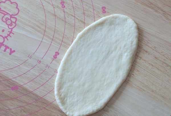 卷好後蓋上保鮮膜松弛10分鐘。松弛後,將面團正面向上搟成橢圓形