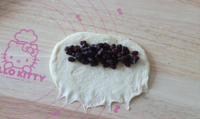 5.翻面後壓底,讓邊緣變薄,放上適量的蜜豆