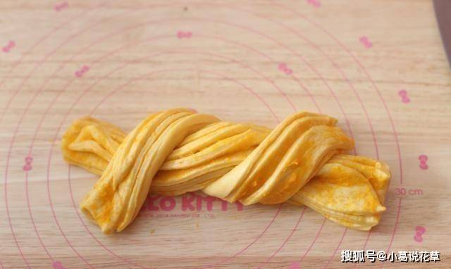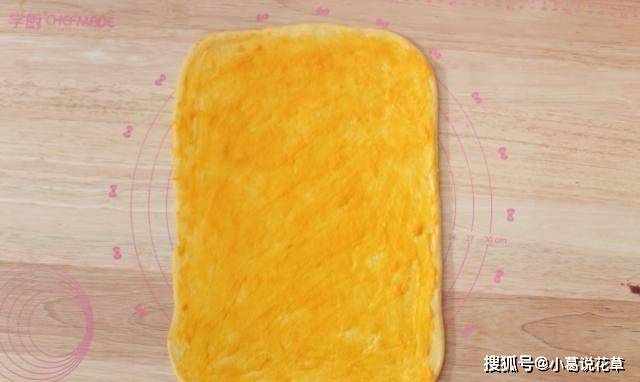 4、醒發後面團變大瞭。取其中一根搟成長方形,然後在上面均勻抹上南瓜泥,從上往上均勻的卷起來