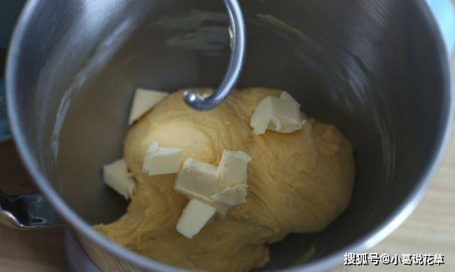 1.將配方中除黃油以外的所有材料放入面團桶中,開始揉面團。當面團成球狀,有一定的筋力時,加入事先軟化的黃油。