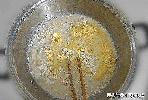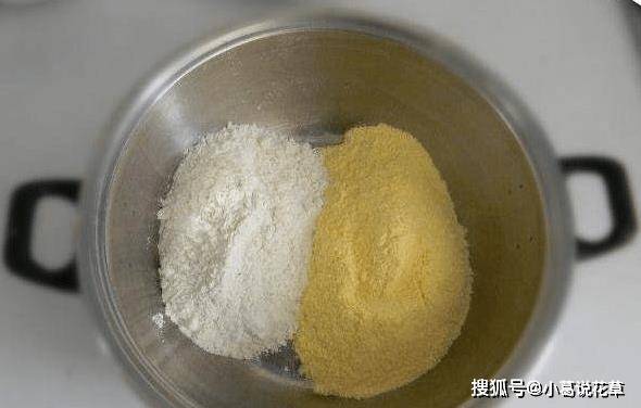 按3:1的比例加入玉米面和面粉,加入牛奶和酵母拌勻