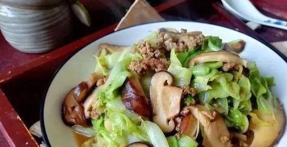 包菜1/2顆、香菇150克、豬肉100克、油鹽適量、薑1片、大蒜2瓣、生抽2湯匙