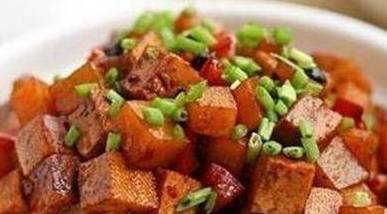 4、翻炒均勻至肉丁入味;放香幹丁,為瞭入味可以加一勺水進來,稍微煮1分鐘讓香幹入味。