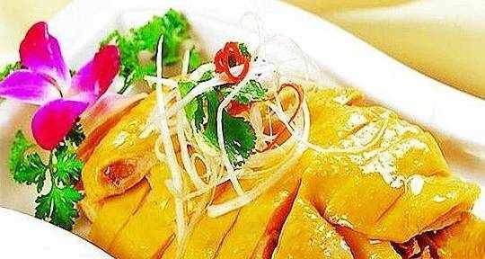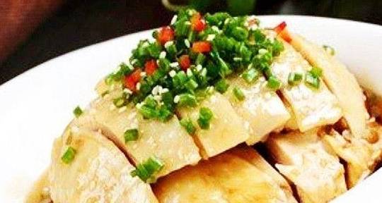 3、雞肉燜好後,撈出,放入事先備好的冰水裡,完全晾涼後,撈出瀝幹水分,切小塊(冷卻的雞肉切著不易散),微熱的蔥油、白糖、生抽、鹽調配好,與香蔥粒一起淋在雞肉塊上,攪拌均勻,靜置半小時入味;