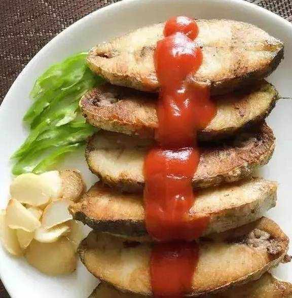 2、鍋內加少許油至八成熱放入蒜片炒熟撈起備用,放魚片煎至焦黃起鍋撒上黑胡椒粉淋上番茄醬。