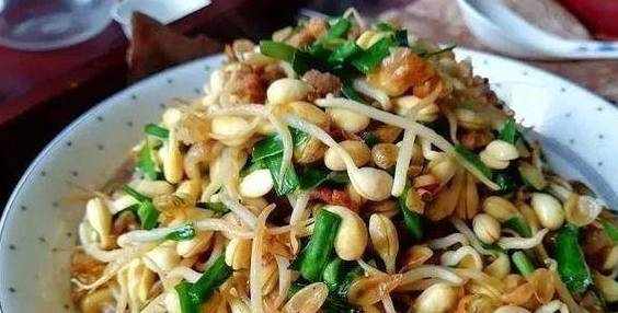 黃豆芽400克、韭菜1把、豬肉150克、油鹽適量、薑1片、大蒜2瓣、料酒1湯匙、生抽醬油1湯匙、米醋少許