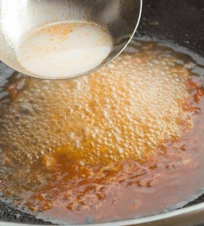 5、鍋內放油,油溫達到50%熱時,放入郫縣豆瓣醬,炒出紅油,加入蔥、薑、蒜炒香。