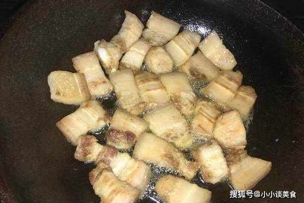 3、鍋中倒入少許油,將豬頭煎至出油,炸至表面金黃微焦,即可食用。帶骨的五花肉,我選的,先在鍋裡炸出肥肉,撈出,然後加入骨頭再炒一點。