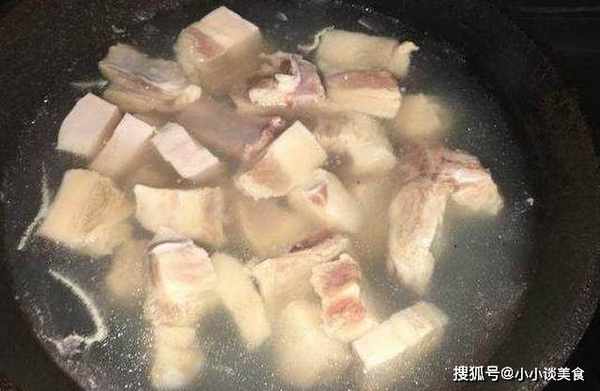 2.鍋中燒開水。水開後,將五花肉焯水,撈出沖洗幹凈表面的浮沫。