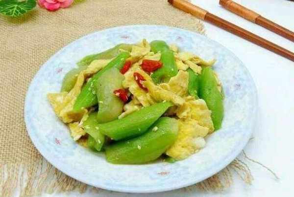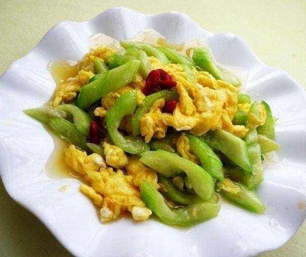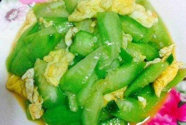 把鍋洗幹凈,燒熱,加入少許食用油。油溫60%以上,倒入打散的蛋液。將蛋液煎一會兒,直到它形成,然後轉動或攪拌雞蛋。待蛋液形成時,再次倒掉油,從鍋邊瀝幹水分,然後撈出裝盤待用。同時,鍋中放少許油,炒絲瓜。