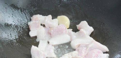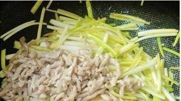 3、準備工作完成後,開始做飯。倒入油並加熱。首先,將醃制好的肉末放入鍋中翻炒,然後加入幹辣椒和薑末一起翻炒出香味。然後將大蒜白和大蒜黃放入鍋中翻炒至順滑。撒少許鹽,炸至順滑即可出鍋食用。