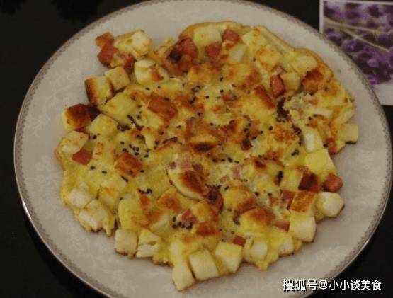 3.將打好的雞蛋倒入碗中。讓蛋液均勻的鋪滿盤底,盡量做的圓一些,然後蓋上。記得用小火。稍微烘烤後,在上面撒上黑胡椒。芝麻一分鐘後即可食用,然後切成小塊,稍微冷卻後食用。