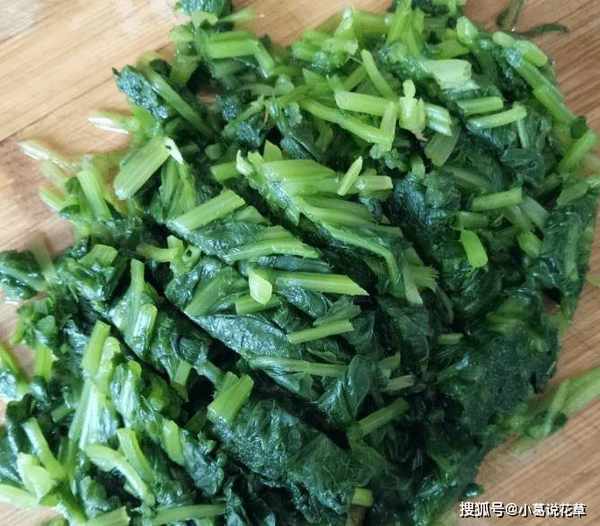 3、蘿卜苗放入冷水中焯一下,瀝幹水分後切成小塊裝盤。這時候把大蒜外面處理一下,切成粒狀,放在小碗裡。