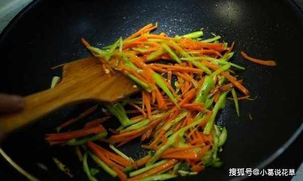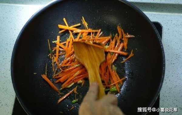4、先加入胡蘿卜絲,因為胡蘿卜中的維生素A是脂溶性的,所以我們要先炒一下,多翻幾下,讓胡蘿卜絲變軟。
