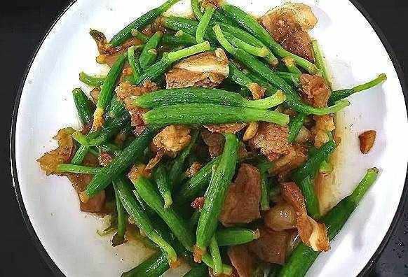 起鍋,倒入橄欖油,油溫達到要求時,放入蒜粒,提香後,放入五花肉塊,快速翻炒,然後放入黃瓜花,這兩種材料快速翻炒2分鐘,加入適量鹽,加入雞精翻炒至入味,即可起鍋裝盤。