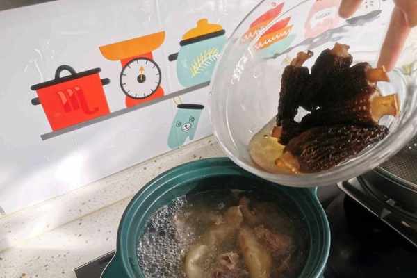 4、燉煮20分鐘之後再加入羊肚菌和紅棗以及枸杞。