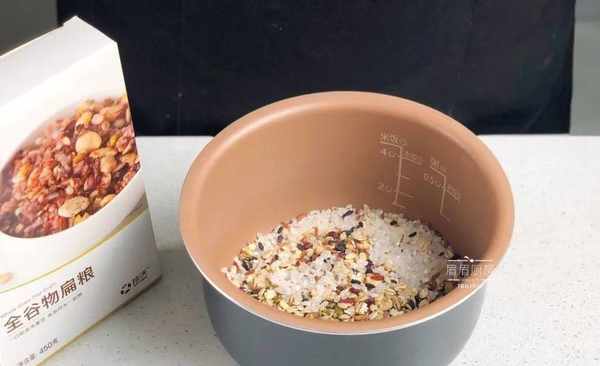 1、電飯煲中倒入150克全谷物扁糧,15種谷物雜豆壓制而成,不用提前浸泡和大米同煮同熟,保證每餐都能攝入15種谷物雜豆,對健康十分有益;