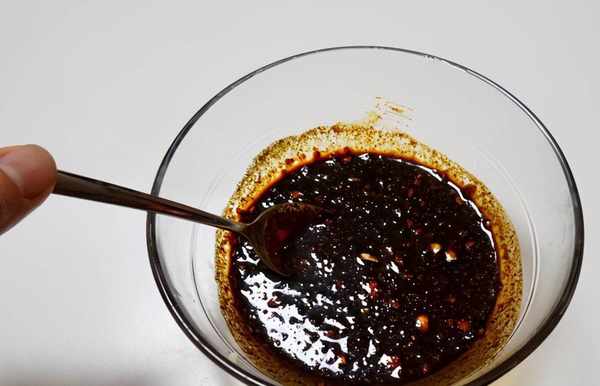8、然後倒入適量的黑胡椒,生抽,老抽,鹽,蜂蜜,攪拌均勻,放在一邊備用。