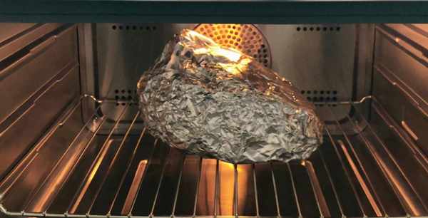 14、用錫紙包裹住整隻雞,烤箱預熱180度,把雞放在下層烤制60分鐘。