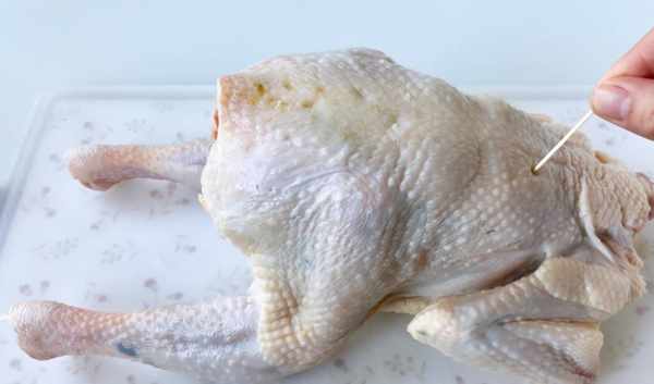 2、用牙簽在雞肉上均勻的紮上小洞,在雞腿和雞胸這兩個地方紮得多一點,因為這兩個地方的肉厚,紮少瞭不入味。