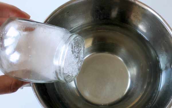 3、拿一個大點的盆,倒入水和鹽,水和鹽的比例是100:6,這樣醃制出來的三黃雞會有一定的咸味。