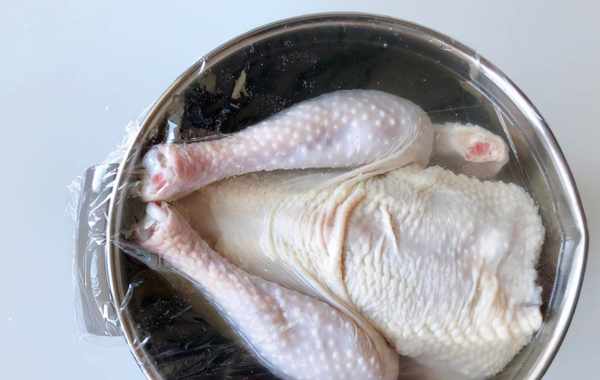 4、把三黃雞放進鹽水裡,保證鹽水能夠沒過雞身,然後用保鮮膜包裹好,放進冰箱,冷藏入味兩個小時就可以瞭。